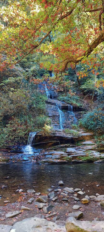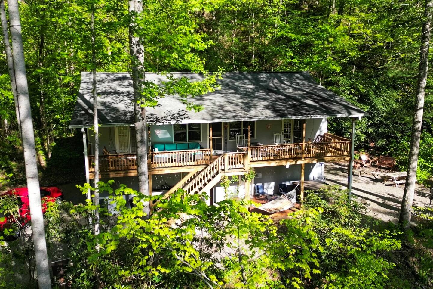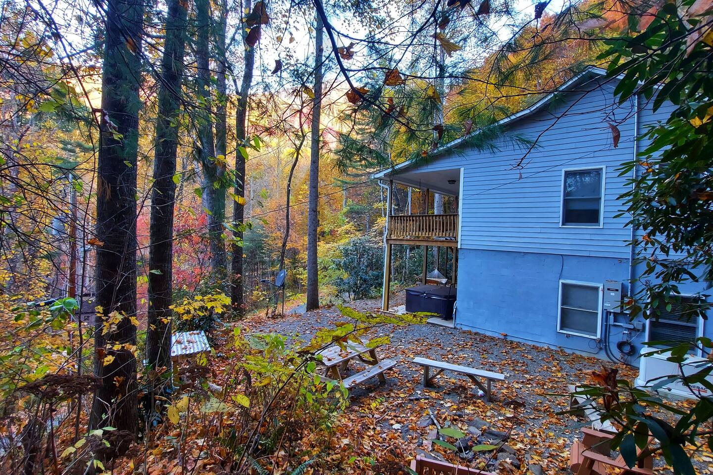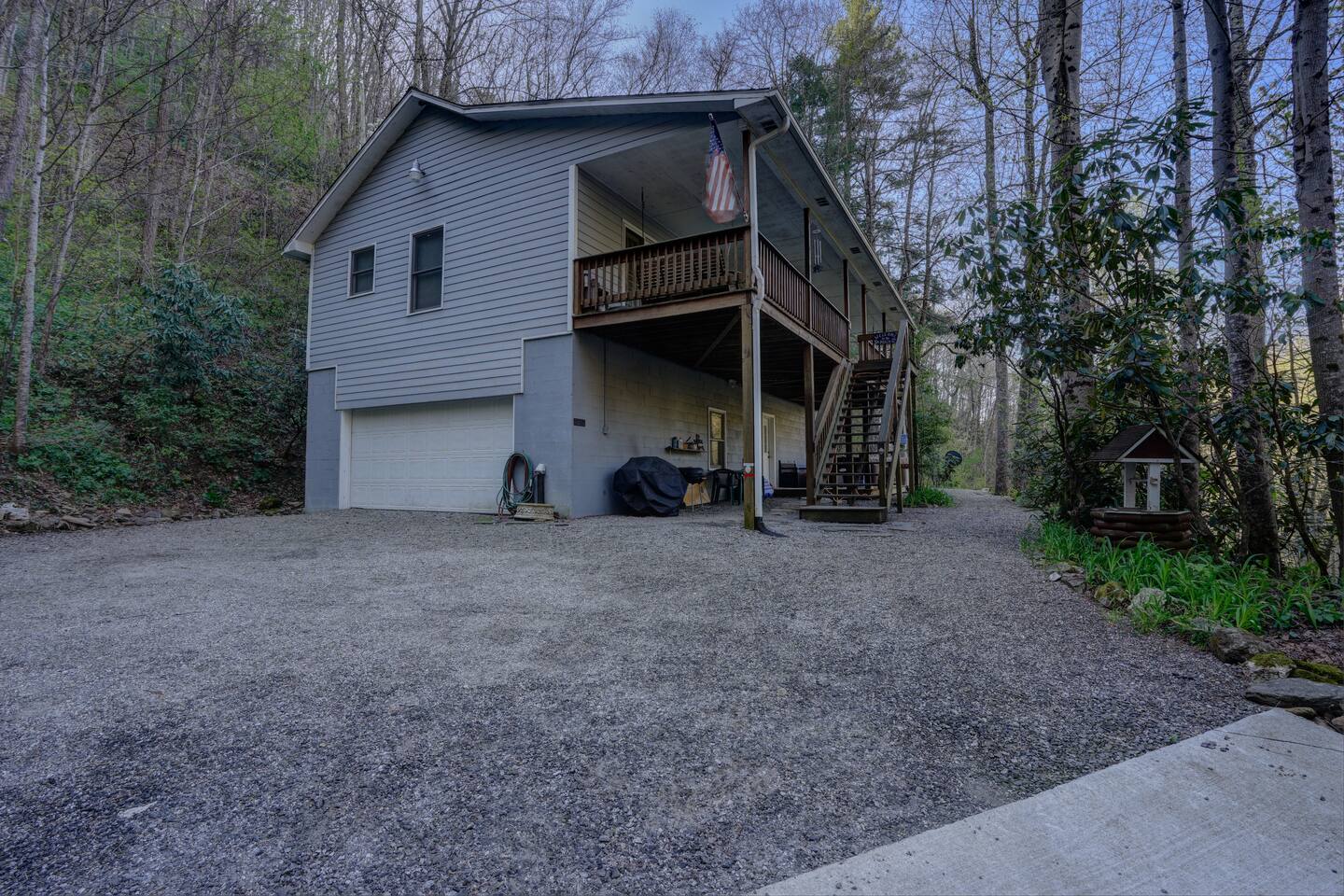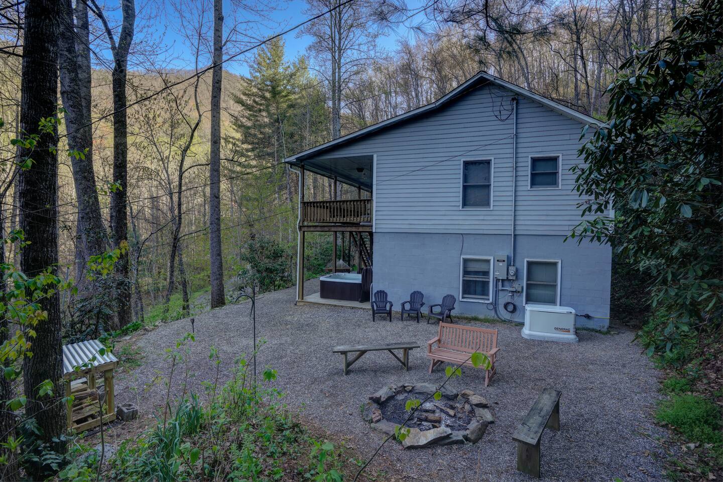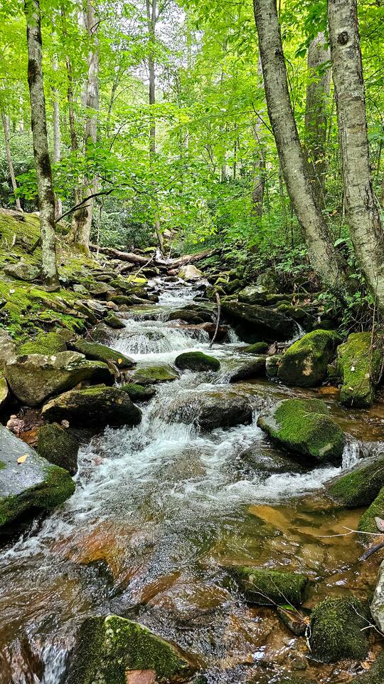 The house is nestled into the trees on the side of a ridgeline at 3,000 feet elevation. There are neighboring houses, but with large lots and lots of trees, it feels secluded and private. The only traffic on the road are the occupants of the other homes. We own the lot on the other side of the road, which offers creek access. The main floor is the upper level. You'll ascend a wooden staircase to get there. You enter in the center of the house, which is the living area. There are two bedrooms on opposite sides of the floor with ensuite baths. Each bedroom also has its own door to the porch. One bedroom has a king-sized bed. The other has a queen and twin beds. In between the two bedrooms is a large living/dining area, a well-stocked kitchen, and a laundry room with a half bath make up the rest of the main floor. There is a desk for those that need to get some work done. The porch is large and has two swings, two rocking chairs, and a seating area. As you sit on the porch, you'll enjoy a beautiful, short-range mountain view to the West. The ridge you will see in front of you is part of Sheepback Mountain. If you're there at sunset and twilight, you'll see the sunset colors over the ridge. You'll hear the wind blowing through the leaves and the sound of water in the cascading creek down at the road. It's beautiful and peaceful, and our guests can't get enough of it. On the ground floor near the staircase, you'll find two grills. One is propane. The other charcoal. On the deck on the ground floor, you'll find the hot tub. While the view is not as grand as the upstairs porch, it's still a nice view, and it's a lovely setting with the trees in front of you. If you walk to the southside of the house, you'll find a fire pit with plenty of seating. You'll have trees on three sides of you, and the house on the other. You have privacy, but you can also see the short-range mountain views to the West. If you walk down our driveway and turn right and walk thirty yards, you'll see a wooden staircase descending to the creek. We own this lot and have built this staircase and deck for our guests' use. You'll find some seating to enjoy the sights and sounds of the beautiful, cascading creek. It's lovely!