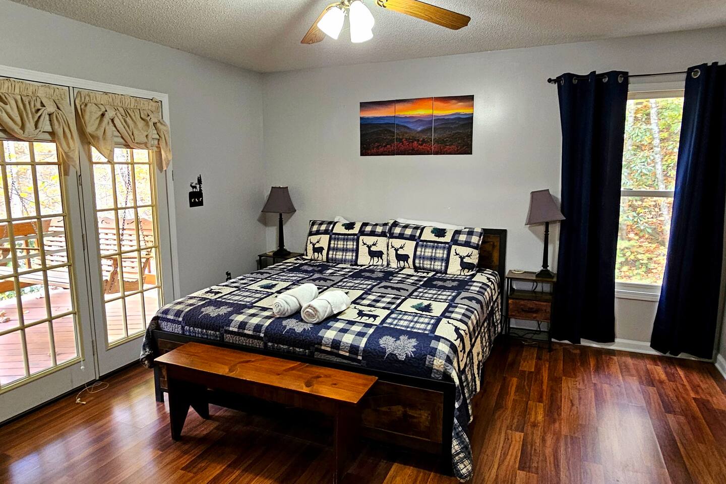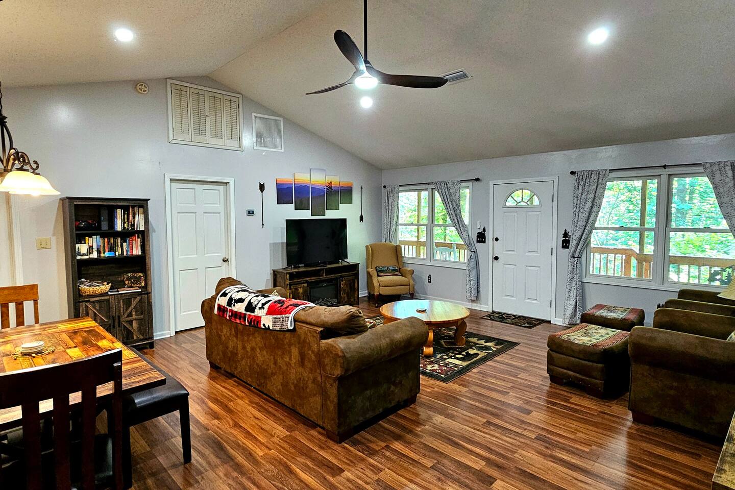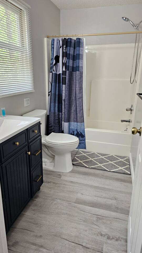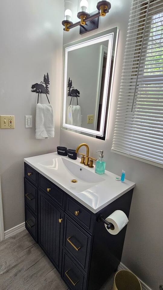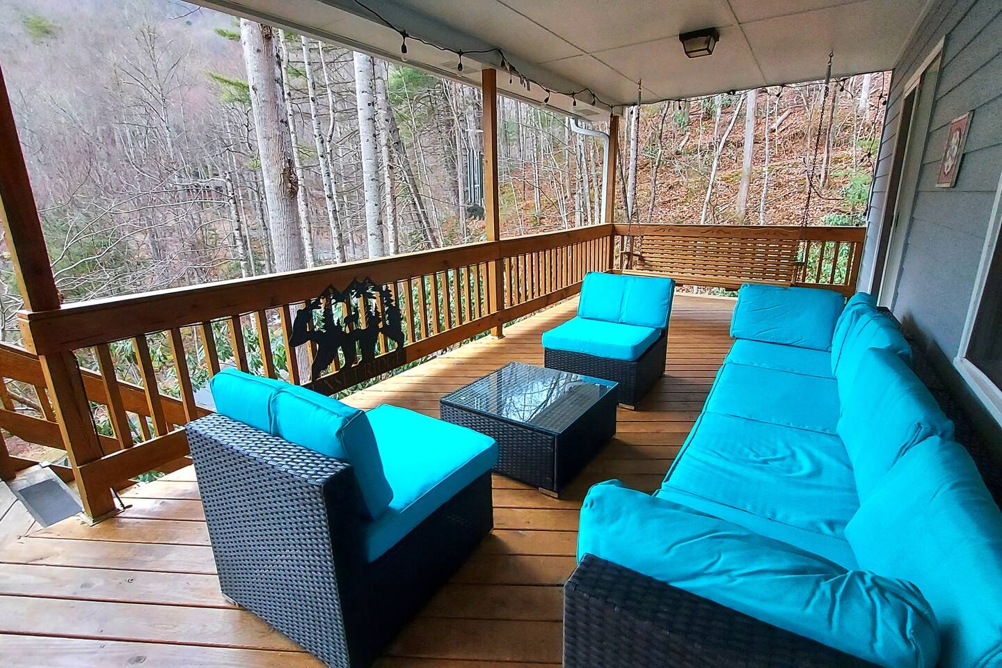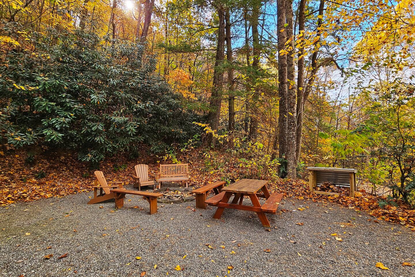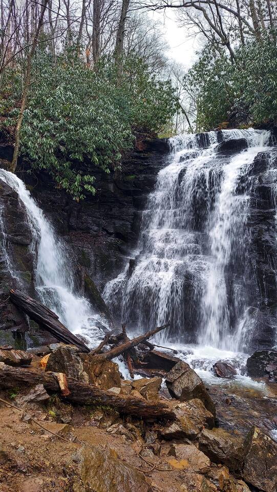 The house is nestled into the trees on the side of a ridgeline at 3,000 feet elevation. There are neighboring houses, but with large lots and lots of trees, it feels secluded and private. The only traffic on the road are the occupants of the other homes. We own the lot on the other side of the road, which offers creek access. The main floor is the upper level. You'll ascend a wooden staircase to get there. You enter in the center of the house, which is the living area. There are two bedrooms on opposite sides of the floor with ensuite baths. Each bedroom also has its own door to the porch. One bedroom has a king-sized bed. The other has a queen and twin beds. In between the two bedrooms is a large living/dining area, a well-stocked kitchen, and a laundry room with a half bath make up the rest of the main floor. There is a desk for those that need to get some work done. The porch is large and has two swings, two rocking chairs, and a seating area. As you sit on the porch, you'll enjoy a beautiful, short-range mountain view to the West. The ridge you will see in front of you is part of Sheepback Mountain. If you're there at sunset and twilight, you'll see the sunset colors over the ridge. You'll hear the wind blowing through the leaves and the sound of water in the cascading creek down at the road. It's beautiful and peaceful, and our guests can't get enough of it. On the ground floor near the staircase, you'll find two grills. One is propane. The other charcoal. On the deck on the ground floor, you'll find the hot tub. While the view is not as grand as the upstairs porch, it's still a nice view, and it's a lovely setting with the trees in front of you. If you walk to the southside of the house, you'll find a fire pit with plenty of seating. You'll have trees on three sides of you, and the house on the other. You have privacy, but you can also see the short-range mountain views to the West. If you walk down our driveway and turn right and walk thirty yards, you'll see a wooden staircase descending to the creek. We own this lot and have built this staircase and deck for our guests' use. You'll find some seating to enjoy the sights and sounds of the beautiful, cascading creek. It's lovely!